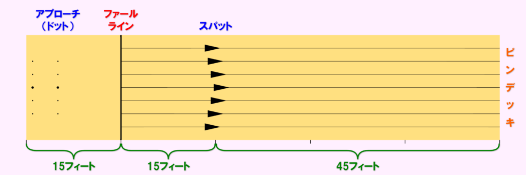 図にはありませんが,図の左側には,投球者が待機する「ボウラーズベンチ」があります. そして,そこから「ファールライン」までの投球動作を行う領域を,「アプローチ」といいます. ファールラインまでは,距離にして約15フィートあります. このアプローチの上で,ボールをスイングしてピンに向かって投げます. 投球するときに,このファールラインをふみこえてしまうと,「ファール」となり,その投球のスコアは0点になってしまいます. (※ これはルールで決められていることなので注意してくださいね)